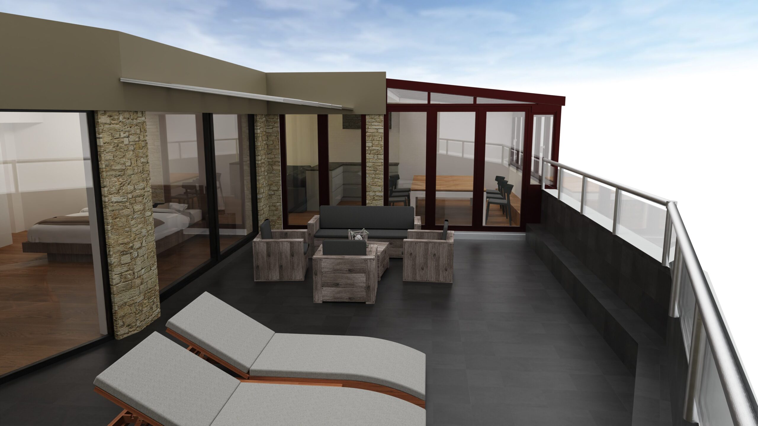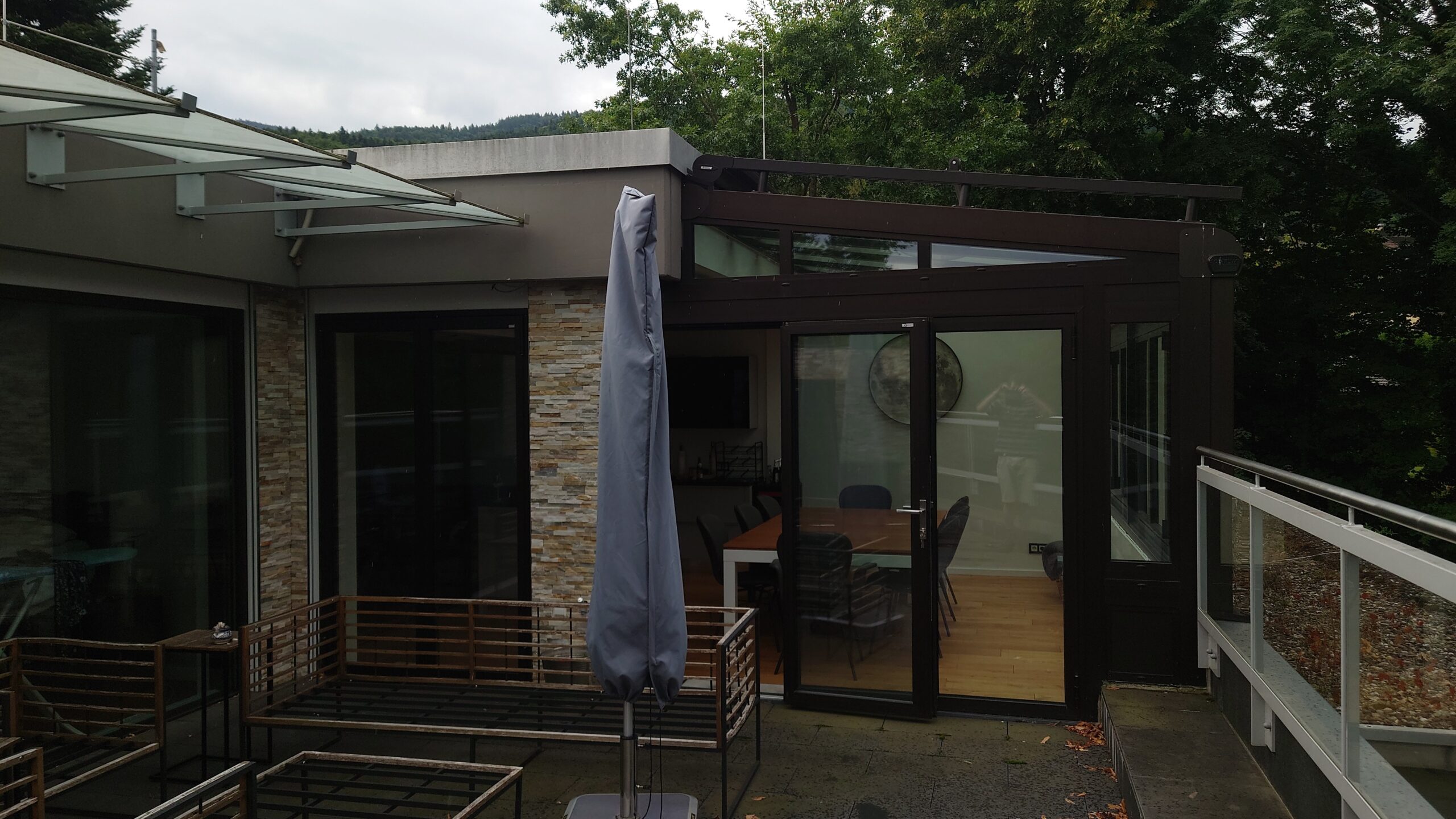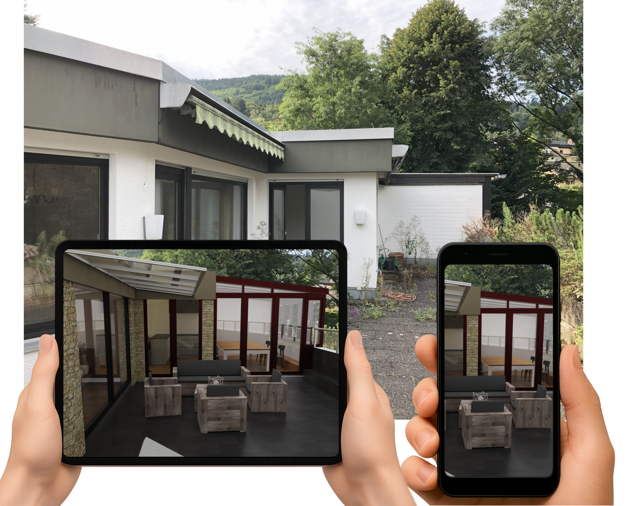 Im Modell lässt er sich direkt am Bestand sehen – nicht nur als Strichzeichnung, sondern in 3D, mit den echten Proportionen. In Augmented Reality kann der Wintergarten sogar in Originalgröße auf die Terrasse gestellt werden. So zeigt sich, ob er harmonisch wirkt, ob genug Platz bleibt oder ob er die Fenster verschattet.